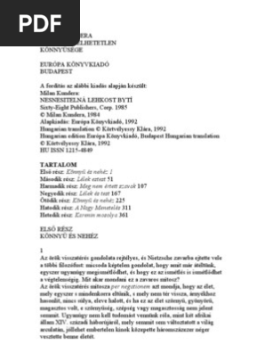 Download as rtf pdf txt or read online from scribd. Jellemzõ életérzés ez korunkban amikor a történelem és a technika a világot olyan jövõ felé vezeti melyet az ember sem alakítani sem elõre látni nem képes. Flag for inappropriate content. Egyfelől szó szerint értelmezhető a kifejezés másfelől a könyv főszereplő jének tomáš nak dillemáit ellentmondásos alakját is fel kívánja idézni amely tartalmában nem de megé.